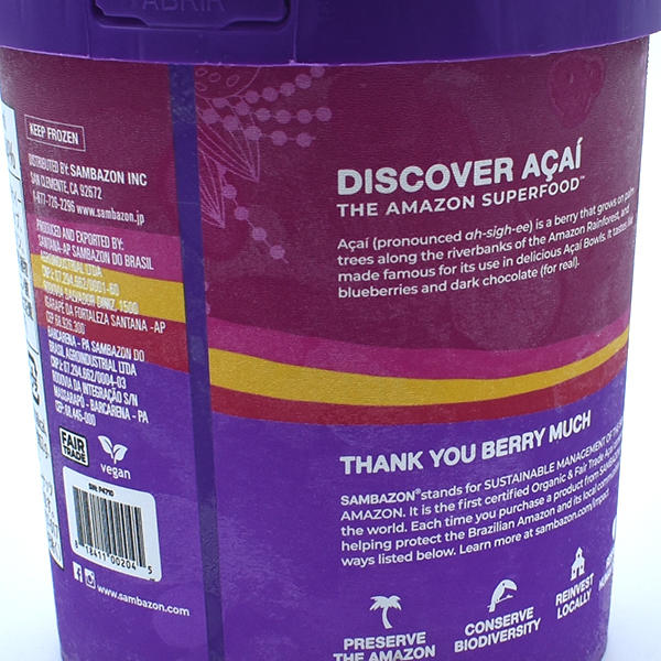 Ingredients: Organic acai puree, sugarcane syrup, tapioca syrup / glycerin, stabilizer (polysaccharide thickener),