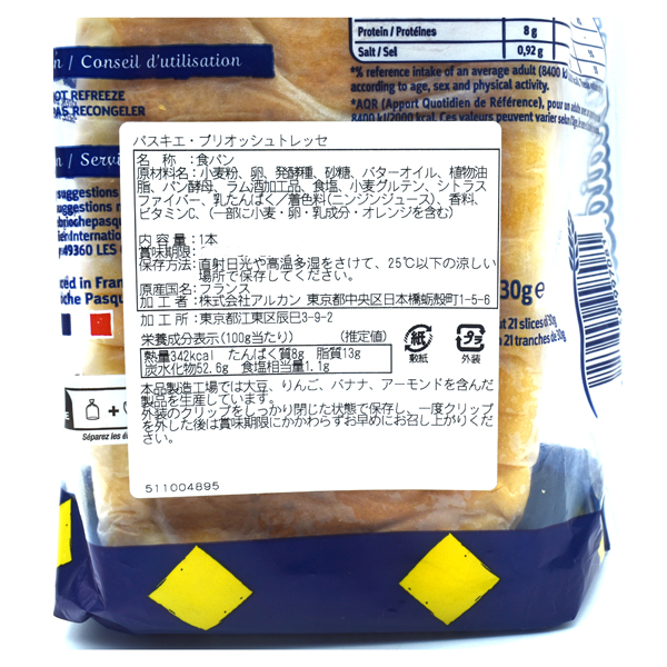 原材料:小麦粉、卵、発酵種、砂糖、バターオイル、植物油脂、パン酵母、ラム酒加工品、