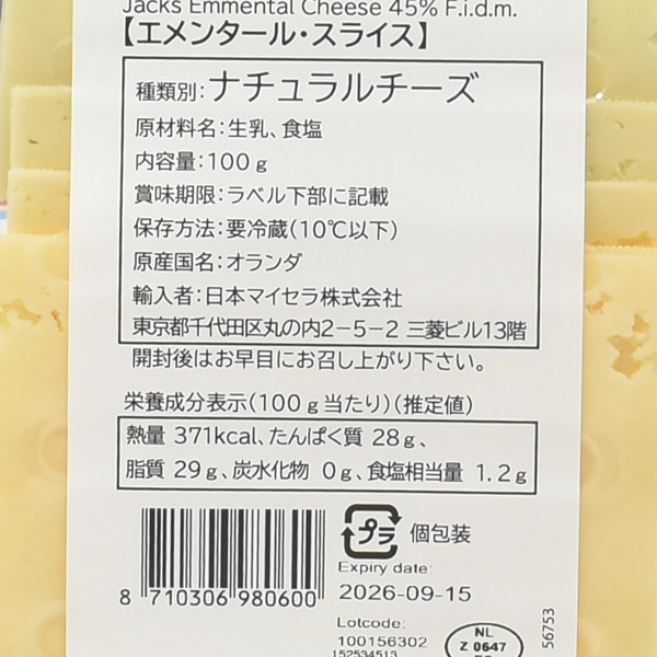 ナッツのような芳醇な香りと、マイルドでコクのある味わいが特徴の、エメンタールチーズのスライスです。