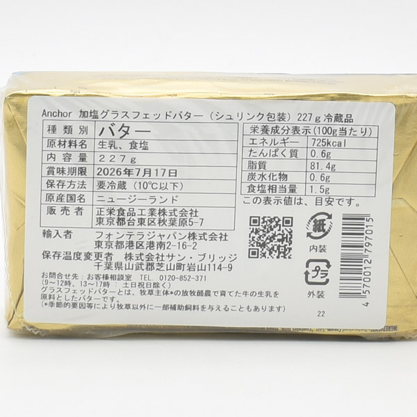 ニュージーランドの広大な牧草地で育った牛のミルクを100%使用した、アンカー社の加塩バターです。