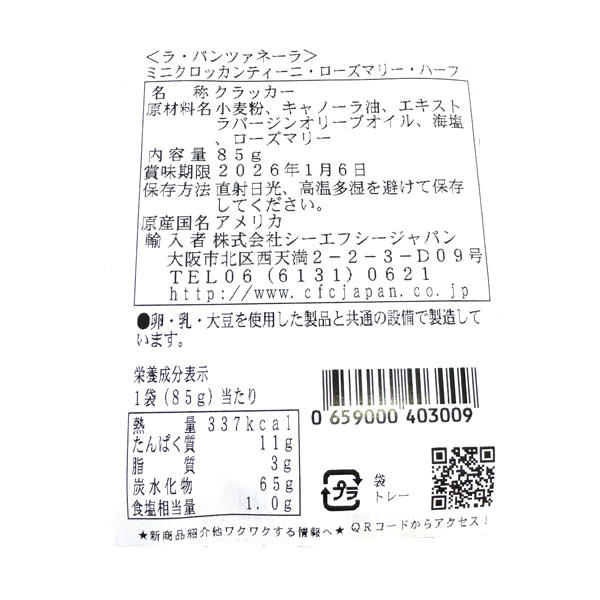 原材料:小麦粉、キャノーラ油、エキストラバージンオリーブオイル、海塩、ローズマリー