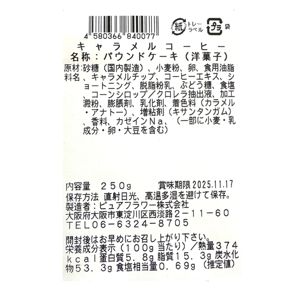 原材料:砂糖(国内製造)、小麦粉、卵、食用油脂、キャラメルチップ、コーヒーエキス、