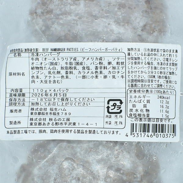 原材料:牛肉(オーストラリア産、アメリカ産)、ソテーオニオン(国産)、牛脂(国産)、パン粉、