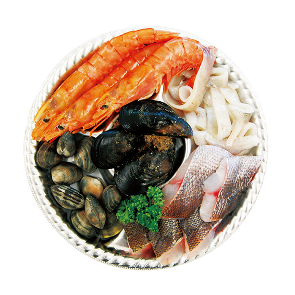 Headed shrimp, white fish, mussels, clams, squid