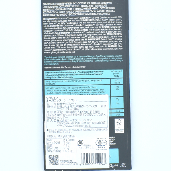 カカオ72%の濃厚なオーガニックダークチョコレートに、まろやかな海塩をブレンドした洗練された一枚です。